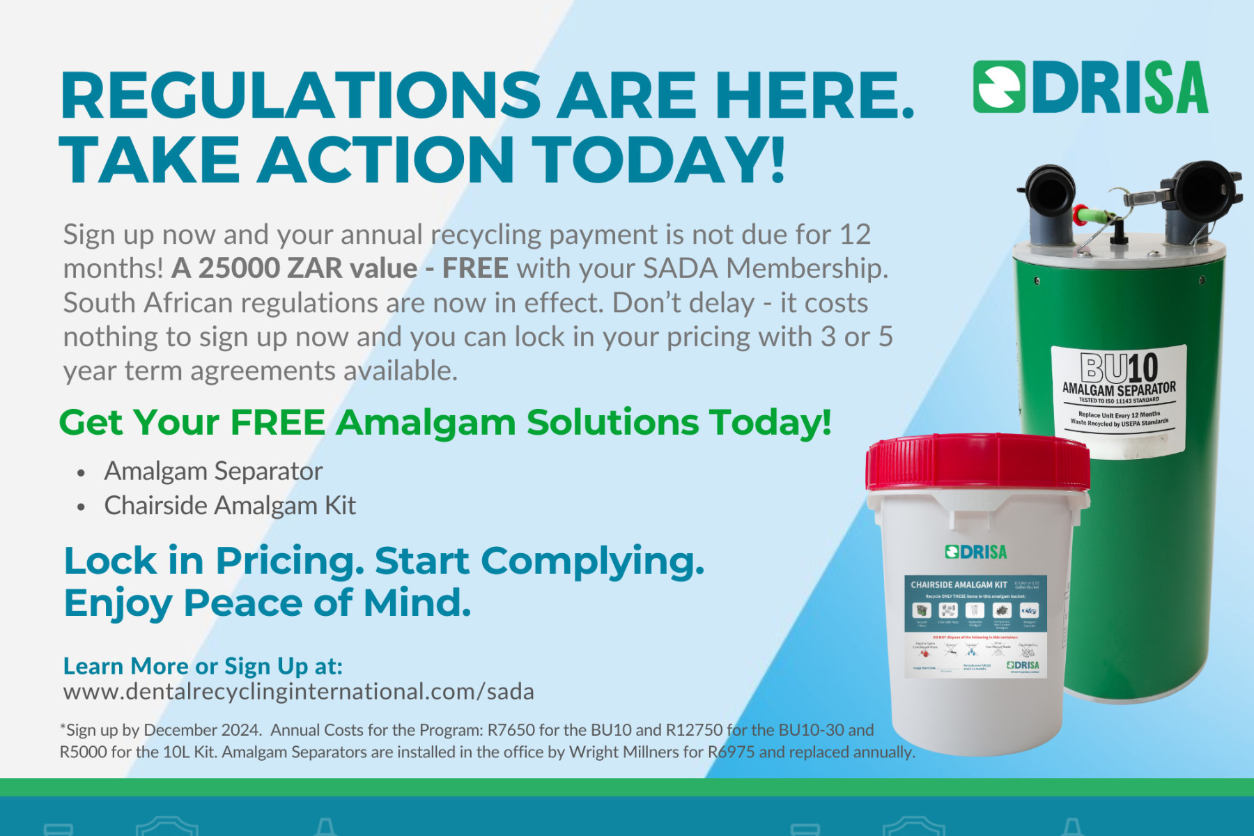As you may already know, our Amalgam Recycling Program with SADA has been designed to ensure that your dental practice stays compliant with the latest regulations regarding the management of mercury in South Africa. We are committed to providing you with comprehensive solutions that not only meet regulatory requirements but also offer convenience and peace of mind.