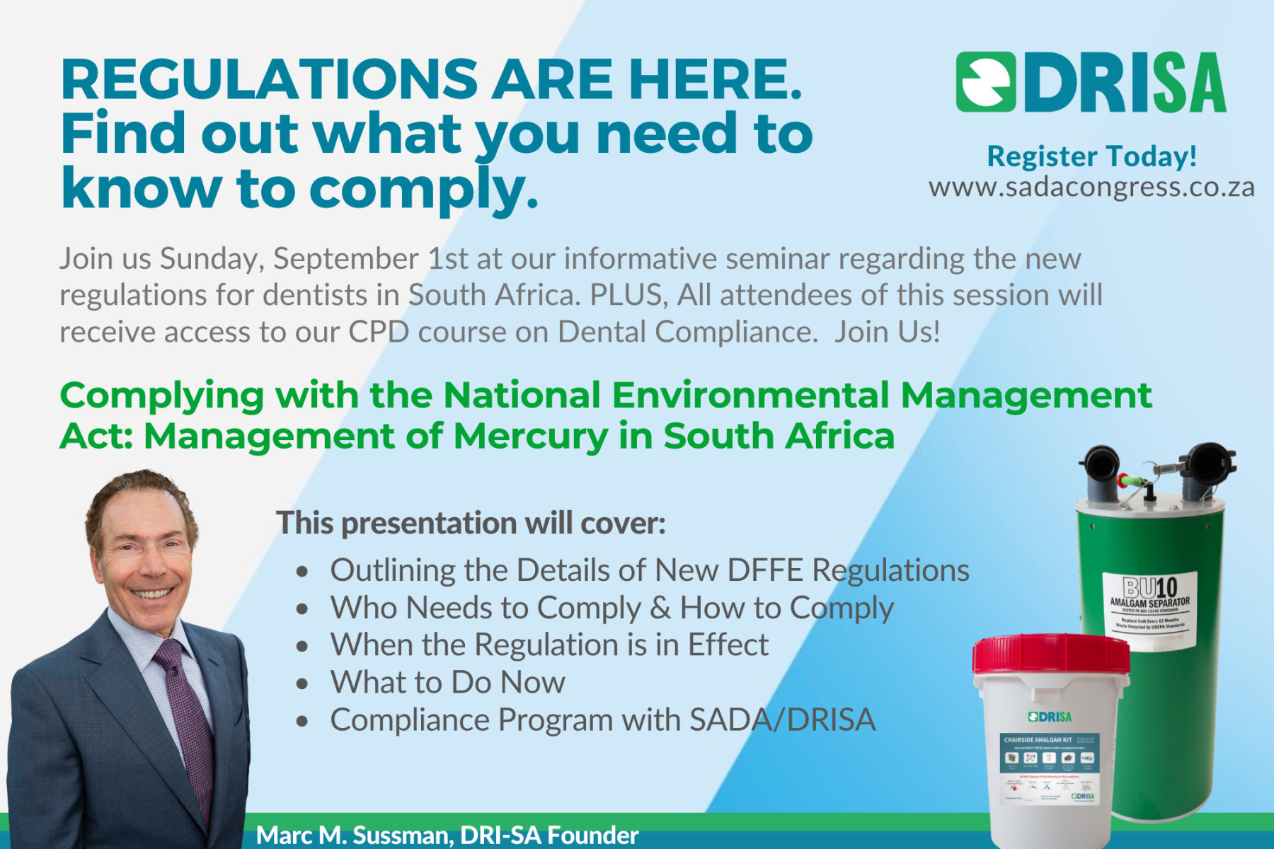 Don’t miss our key educational session titled “Complying with the National Environmental Management Act: Management of Mercury in South Africa.” Presented by Marc M. Sussman of DRI-SA and Martin Botha from AThermal, this session will provide critical insights into the new DFFE regulations. All attendees will receive free access to our DRI-SA developed CPD course on Dental Compliance, ensuring you have all the tools needed to stay compliant. If you missed it, or want to learn about this topic, you can view our presentation from this session presentation here.